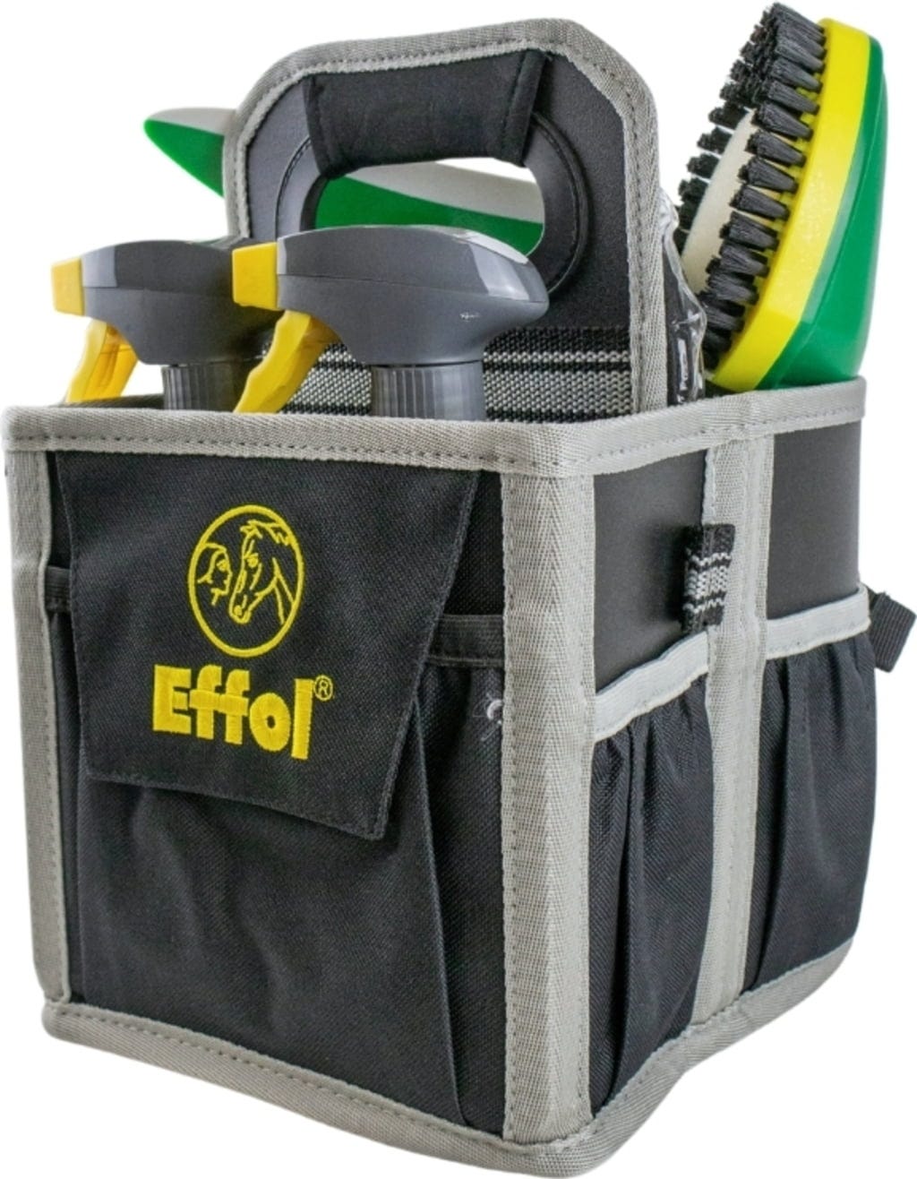 Conosci quella sensazione: stai correndo verso la zona lavaggio o controllando velocemente il tuo cavallo, e hai le mani piene di flaconi e spazzole. La Mini Tote Bag è la soluzione perfetta per trasportare la tua attrezzatura per la cura del cavallo in modo compatto e organizzato. Lo scomparto principale, progettato con cura, può contenere fino a quattro flaconi, mentre le pratiche tasche esterne offrono lo spazio ideale per snack o piccoli oggetti. Una caratteristica speciale è il fondo perforato, che permette all'acqua e allo sporco di defluire facilmente, perfetto per l'uso nella zona lavaggio. Grazie alle opzioni di fissaggio flessibili, puoi anche appendere facilmente la borsa a ganci o porte della stalla, assicurandoti che i tuoi accessori siano sempre riposti ordinatamente e pronti all'uso.