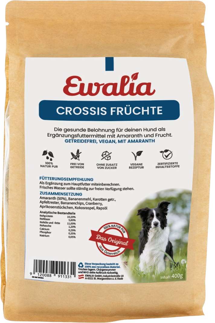 Questi originali snack senza cereali rappresentano una sana alternativa quando vuoi premiare il tuo cane con qualcosa di goloso. Gli snack sono completamente vegan e la loro ricetta è composta da ingredienti di alta qualità come l'amaranto e la frutta.