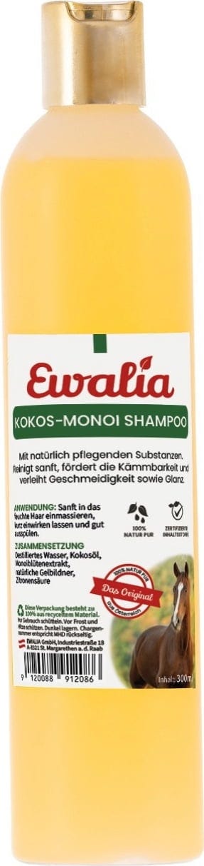 Lo shampoo di EWALIA deterge delicatamente e promuove la pettinabilità. Dona elasticità e lucentezza al crine di cavallo. Contiene ingredienti naturali da olio di cocco biologico e fiori di monoi.