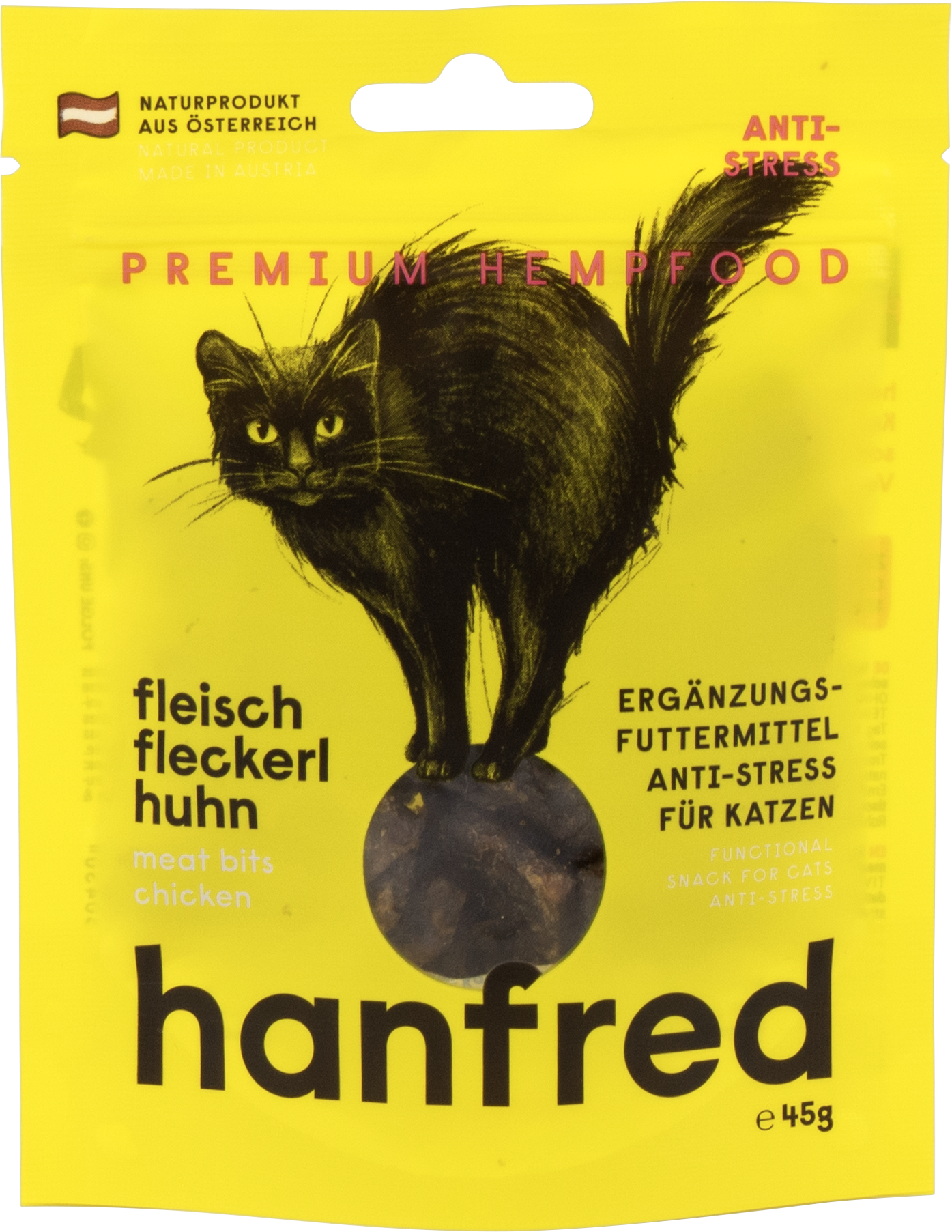 Se il tuo gatto reagisce in modo sensibile a cambiamenti o situazioni stressanti, questo snack può rappresentare una scelta adatta. I bocconcini di carne Hanfred sono composti per il 95% da carne e per il 5% da polvere di canapa, senza cereali né additivi artificiali.