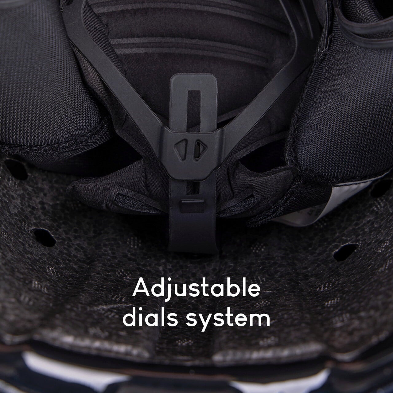 All’interno, la fodera rimovibile in Coolmesh assorbe l’umidità e si asciuga rapidamente, offrendo una piacevole sensazione di freschezza. La vestibilità si regola facilmente tramite il sistema a rotazione posto sul retro, regolabile in altezza, rimovibile e copribile. Il cinturino sottogola, rivestito in similpelle nera, è dotato di una morbida imbottitura sotto il mento e di una chiusura in velcro che consente di adattarne la lunghezza con facilità.