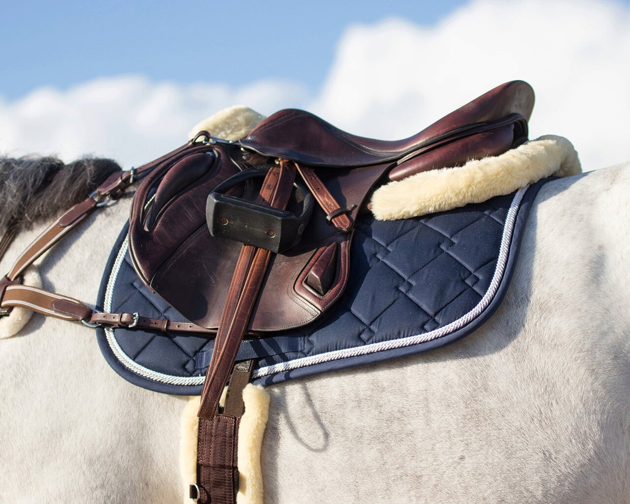 - Bordo in morbida pelliccia sintetica: applicato al garrese e lungo il bordo posteriore, offre protezione contro gli sfregamenti e dona al sottosella un aspetto raffinato.