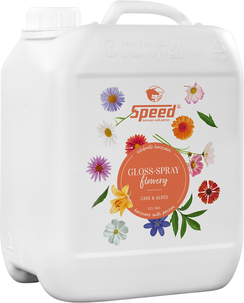 Il Gloss-Spray FLOWERY di SPEED fa brillare criniera, coda e mantello del tuo cavallo. Con il suo delicato profumo di fiori freschi, non solo nutre, ma dona anche al tuo destriero un look perfettamente curato. Polvere e sporco non si attaccano al pelo, la spazzolatura è semplice e il manto acquista volume e morbidezza. Ideale per la cura quotidiana o per le occasioni speciali.