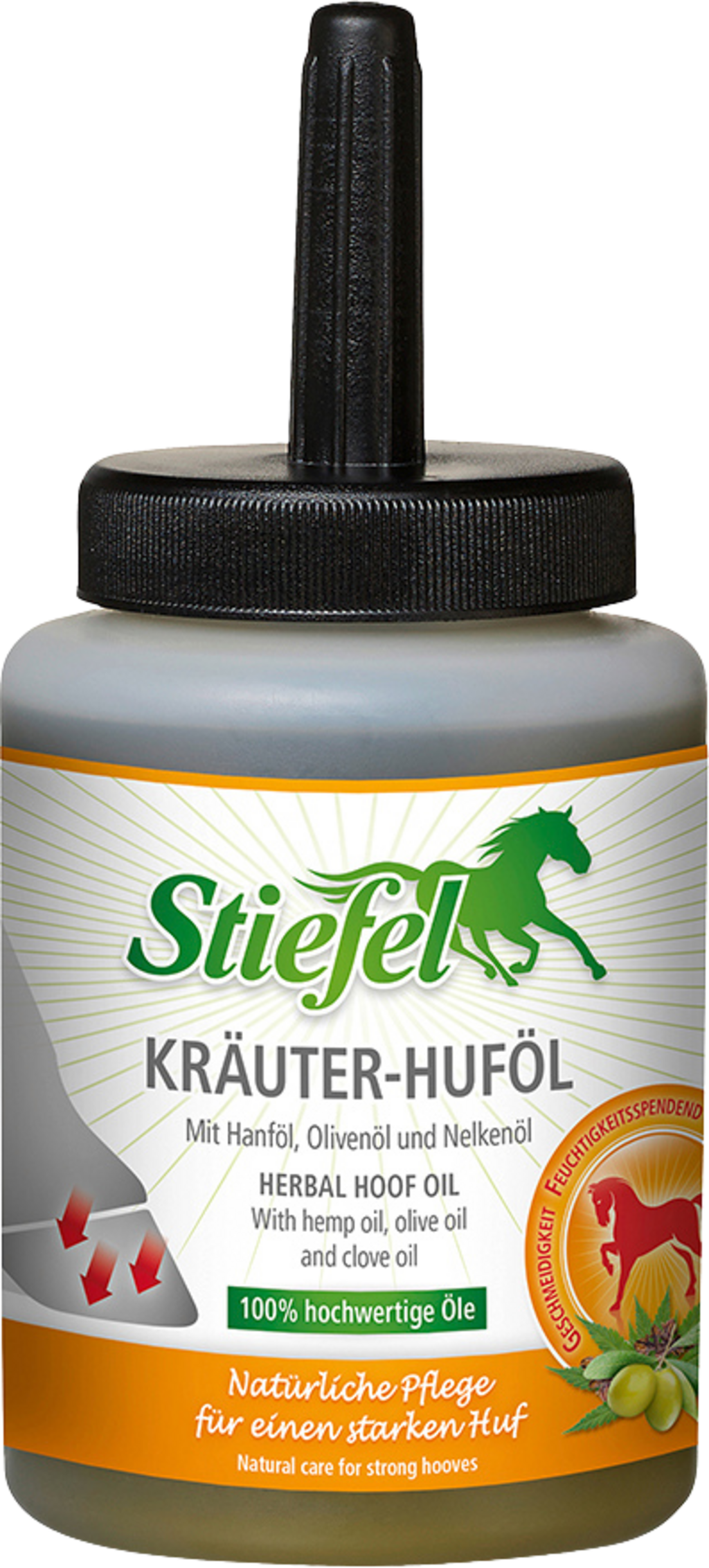 L'Olio per Zoccoli alle Erbe di Stiefel si prende cura degli zoccoli del cavallo in modo naturale. Gli oli nutrienti contenuti possono rafforzare lo zoccolo e renderlo più elastico, prevenendo la secchezza. Grazie alla speciale composizione di oli vegetali e oli essenziali, zoccolo, fettone e coroncina vengono curati e mantenuti elastici. Il prodotto inoltre protegge da influenze esterne aggressive, come il letame. L'olio va usato quotidianamente e può avere un effetto positivo sulla struttura, sull'elasticità e sulla condizione generale degli zoccoli.