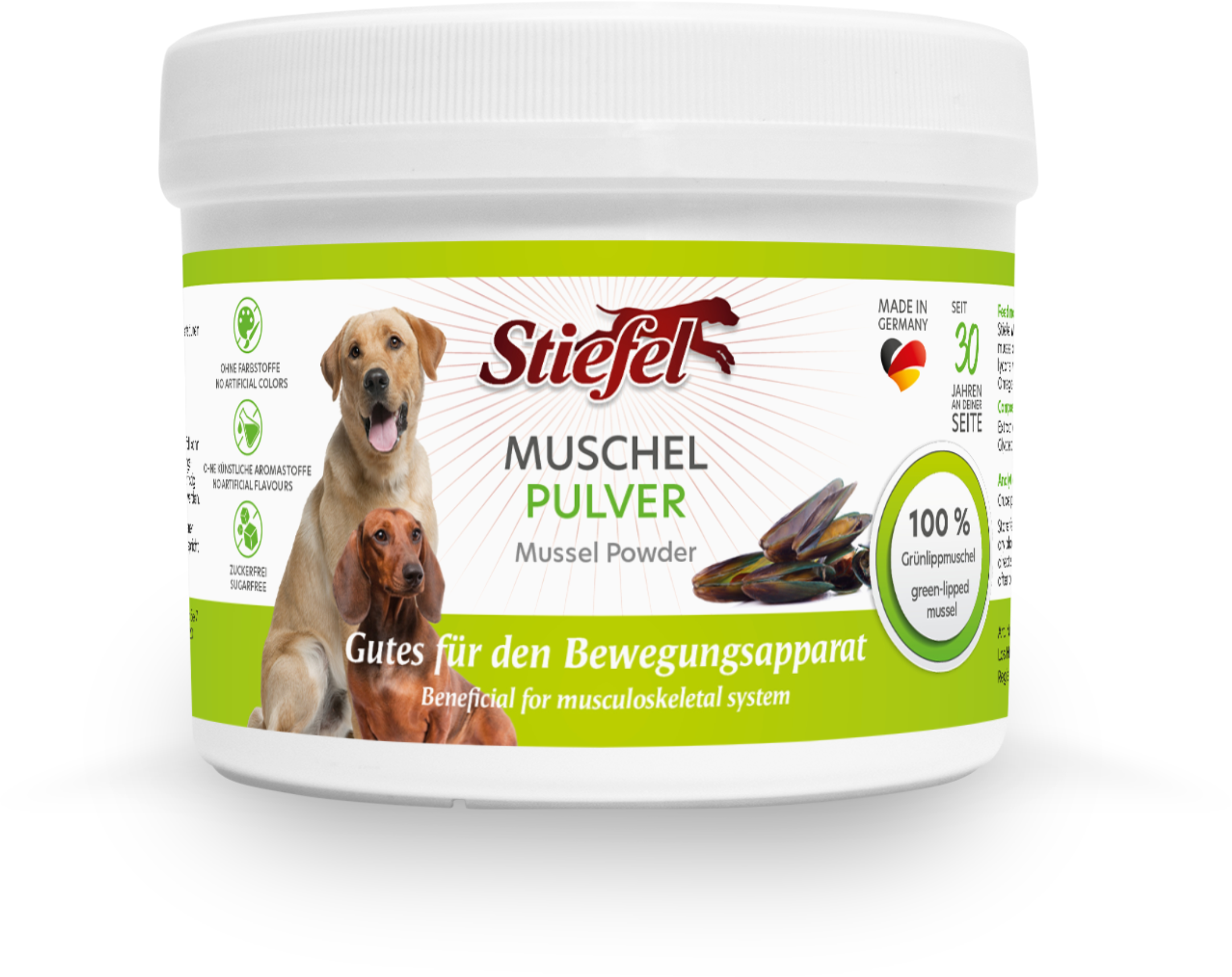 La polvere di cozze di Stiefel è composta al 100% da polvere di cozze verdi. Questo prodotto può avere un effetto positivo sul sistema muscolo-scheletrico perché contiene glicosaminoglicani, importanti per il tessuto connettivo. Il prodotto infatti può supportare il sistema muscolo-scheletrico e i movimenti del tuo cane.