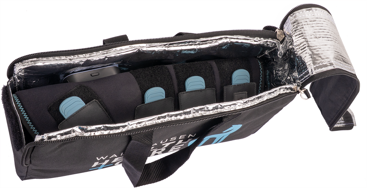 Il paracolpo, grazie alle chiusure in velcro regolabili su entrambi i lati, può essere adattata anatomicamente alla gamba sinistra o destra ed è fornita in una pratica borsa termica isolante. Questa garantisce che gli impacchi refrigeranti mantengano la temperatura anche durante gli spostamenti. Con un’autonomia di circa 90 minuti in modalità combinata di calore e vibrazione, il paracolpo TecSupreme è un partner potente per una gestione professionale del benessere direttamente sulla gamba del cavallo.